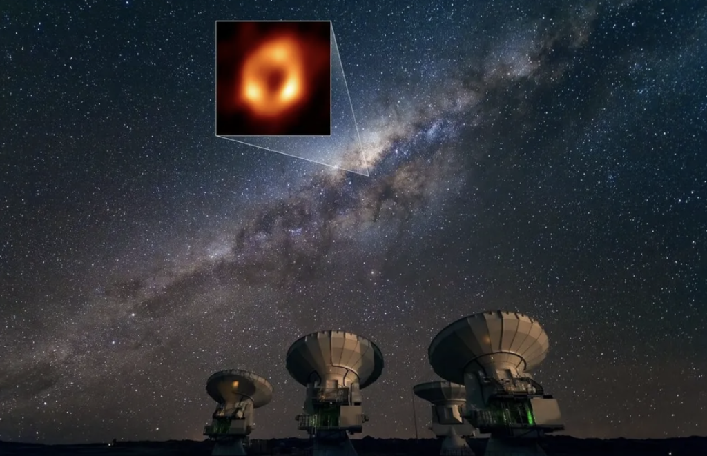 Sagittarius A* je supermasivní černá díra v centru naší galaxie. Má hmotnost 4,3 milionu Sluncí, ale její horizont událostí má „jen“ průměr asi 24 milionů km – to je zhruba 17× větší než Slunce, ale na vzdálenost 26 000 světelných let to je stále maličký úhlový rozměr.